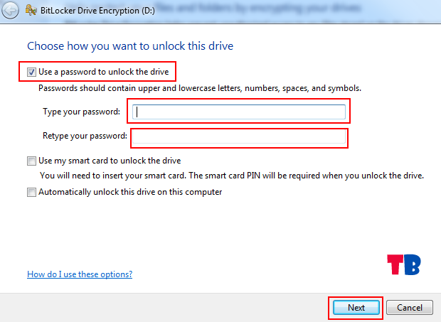 سپس از پنجره باز شده گزینه Use a password to unlock the drive را تیک بزنید و رمز عبور خود را در دو نوار زیرین آن وارد کنید.