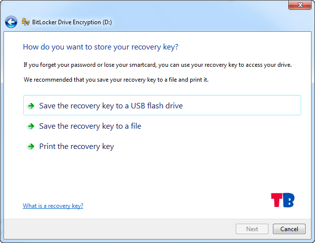 در این مرحله شما می توانید پسورد خود را با انتخاب گزینه Save the recovery key to a file در یکی از درایوهای رایانه ذخیره کنید تا در صورت فراموش کردن آن بتوانید رمز را بازیابی کنید.بعد به روی گزینه Nextکلیک کنید تا وارد مرحله بعد شوید .