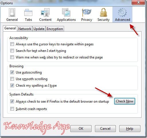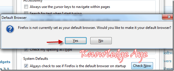 از منوی Firefox ( در نسخه های قبل تر از منوی Tools ) وارد Options شده و بعد در صفحه باز شده از تب Advanced و سپس از تب General واز قسمت System defaults روی دکمه Check Now کلیک کرده و در پیغام نمایش داده شده روی دکمه Yes کلیک کنید.