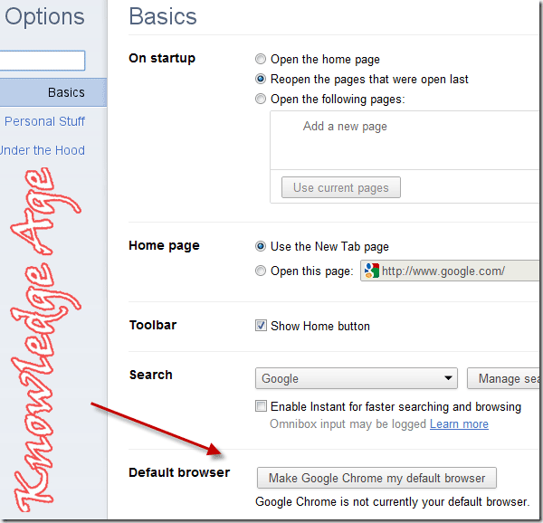 ابتدا روی آیکن آچار که در بالا و سمت راست نوار آدرس قرار دارد کلیک کنید و Options را انتخاب کنید. سپس از تب Basics و در قسمت Default Browser روی دکمه Make Google Chrome my default browser کلیک کنید.